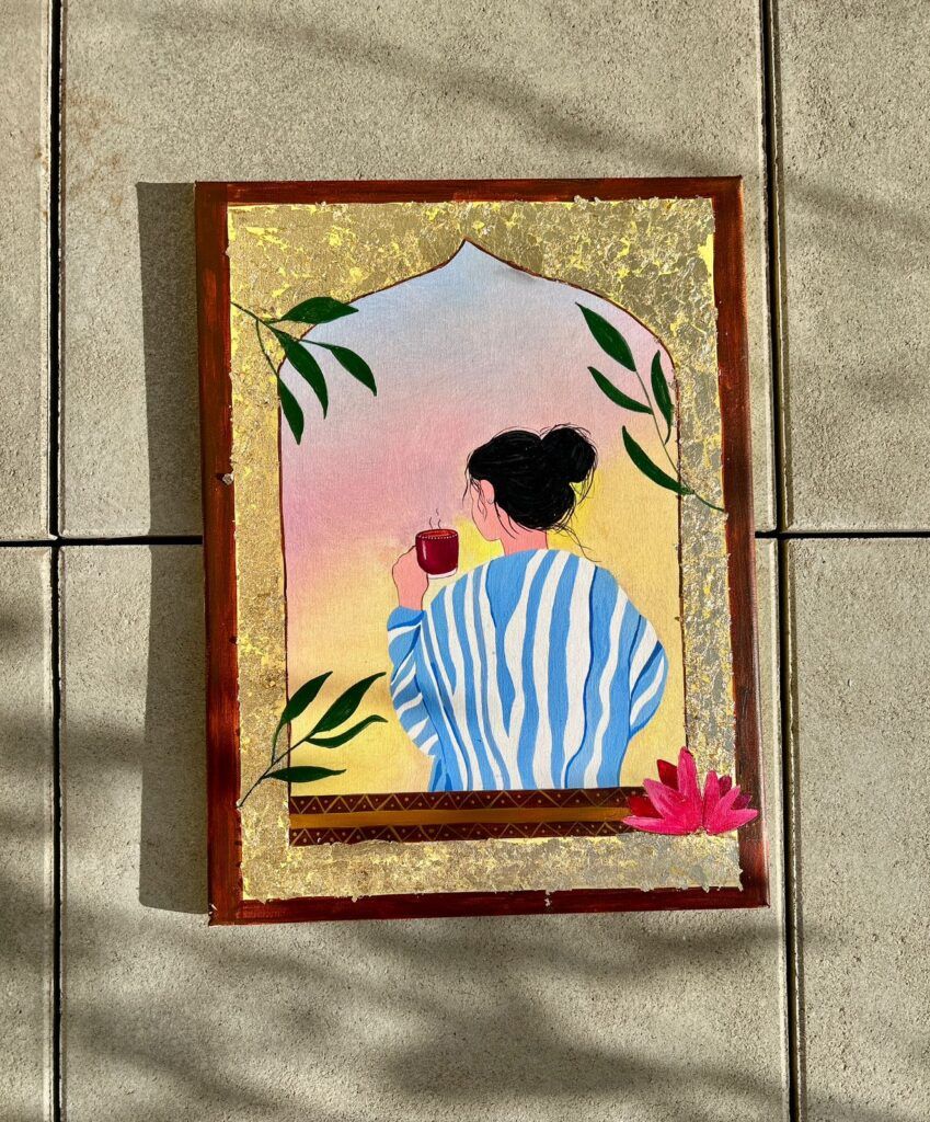 The arched frame she looks through is inspired by traditional Indian and Middle Eastern architecture, a design often seen in ancient palaces and temples. To me, it symbolizes a portal — a window not only to the world outside but also to the world within. Through this window, she looks at the sunrise, but metaphorically, she also looks inward, toward her thoughts, dreams, and inner calm.