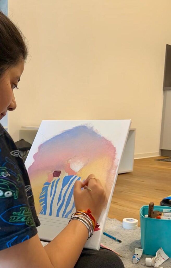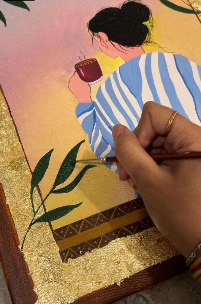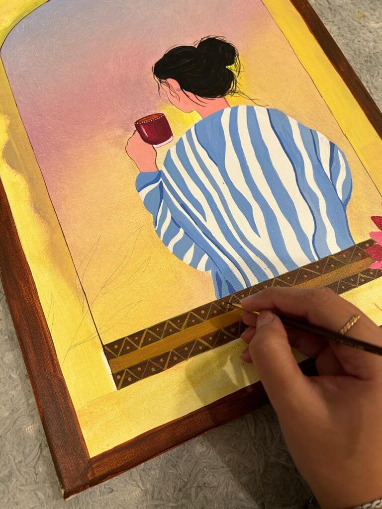 I wanted to capture not just the visual beauty of that scene, but the emotion of it — the peace that comes from solitude, and the subtle joy of embracing one’s own company. The woman in the painting represents anyone who seeks balance in life’s rush — she could be any of us, pausing with a cup of tea or coffee, finding a moment of reflection before stepping into the day.