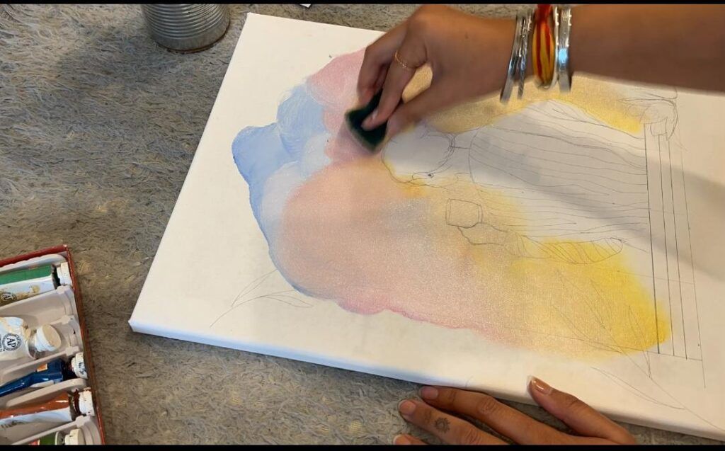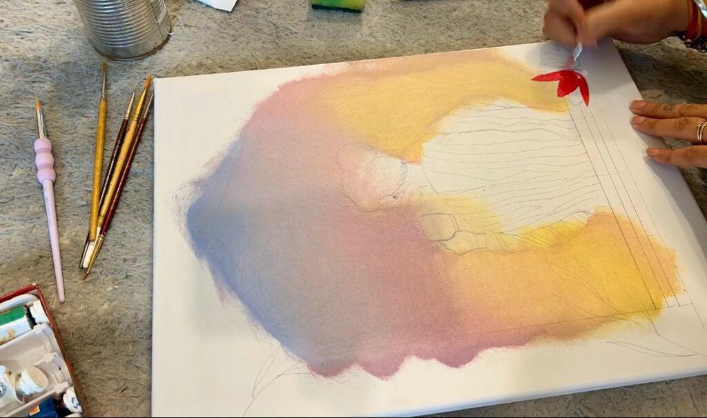 Once the composition was set, I built the background first. Using a combination of blending and dry-brush techniques, I layered the soft hues of dawn, moving gradually from pink to yellow to pale lavender. This background forms the emotional foundation of the painting — the light itself tells the story.