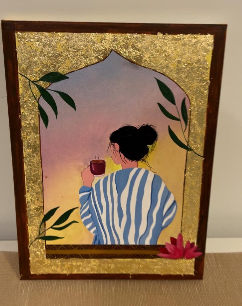 In this acrylic painting, a woman stands by an ornate arched window, holding a cup of tea as she looks out into the soft hues of dawn. The sky is bathed in gradients of pink, gold, and peach — a palette that evokes warmth, hope, and calm renewal. The golden border, delicately textured and imperfect in places, enhances the glow of the piece, while the graceful leaves and soft pink flower add organic life to the composition. Every detail invites the viewer to step into that quiet space — a world suspended between night and day, thought and emotion.